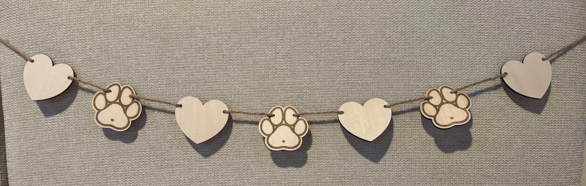 Une somptueuse guirlande embellie de patte de chien , agrémentée de délicats cœurs et de cœur, le tout suspendu à une corde en jute de 1,75 m.
